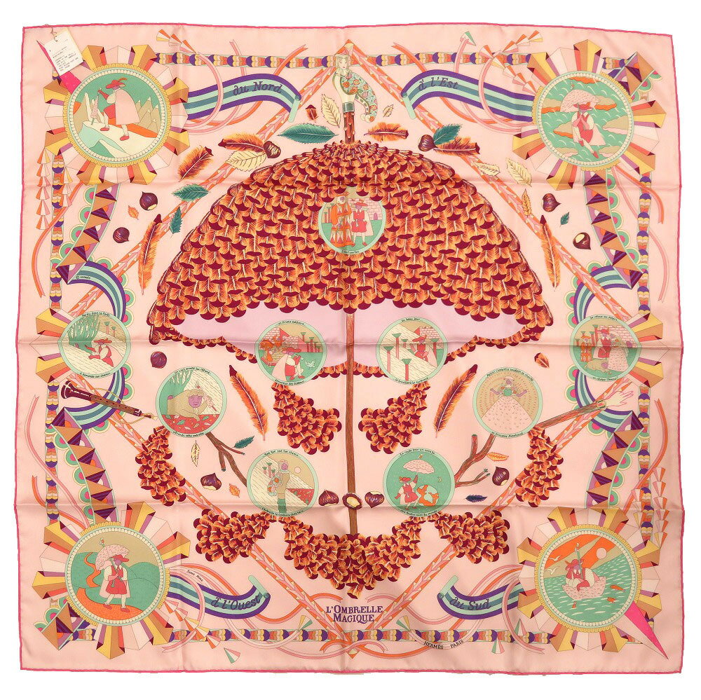 未使用 エルメス カレ90 L'OMBRELLE MAGIQUE 魔法の杖傘 ローズプードル ヴェールアマンド シルク100% 0331 【中古】 HERMES