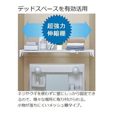 ねじや釘を使わずに壁にしっかりと固定できる伸縮棚!圧着部をL字型にすることで、十分な耐荷重を実現!ポールが自由に伸縮するため、段差のある壁も取り付け可能です。