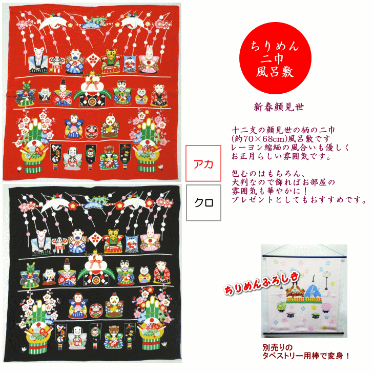 商 品 詳 細 素材 レーヨン100% サイズ 縦約70cm 横約68cm 特徴 縮緬二巾風呂敷です 飾って楽しむこともでき、タペストリーにもなります(専用の棒使用) 同柄でアカ、クロの2色です 注意 画面上と実物では多少具合が異なって見える場合もございます ご了承下さい この商品は当店実店舗でも販売しております。